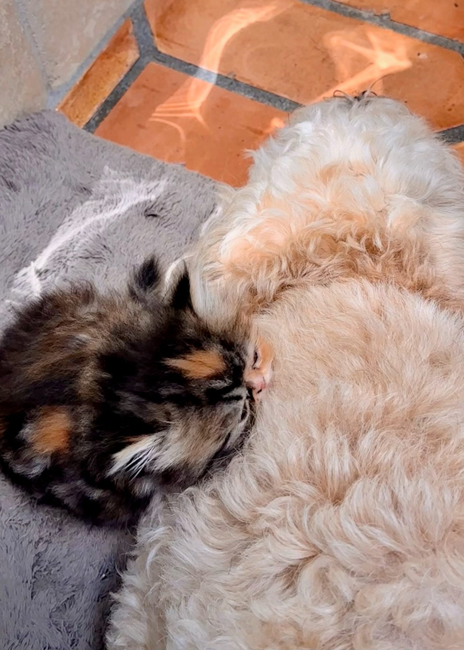 Our gorgeous Brown-Patched Tabby girl, we call Cali. She is just striking and personality plus. As you can see she loves snuggling with her nanny dog, as well as her people.