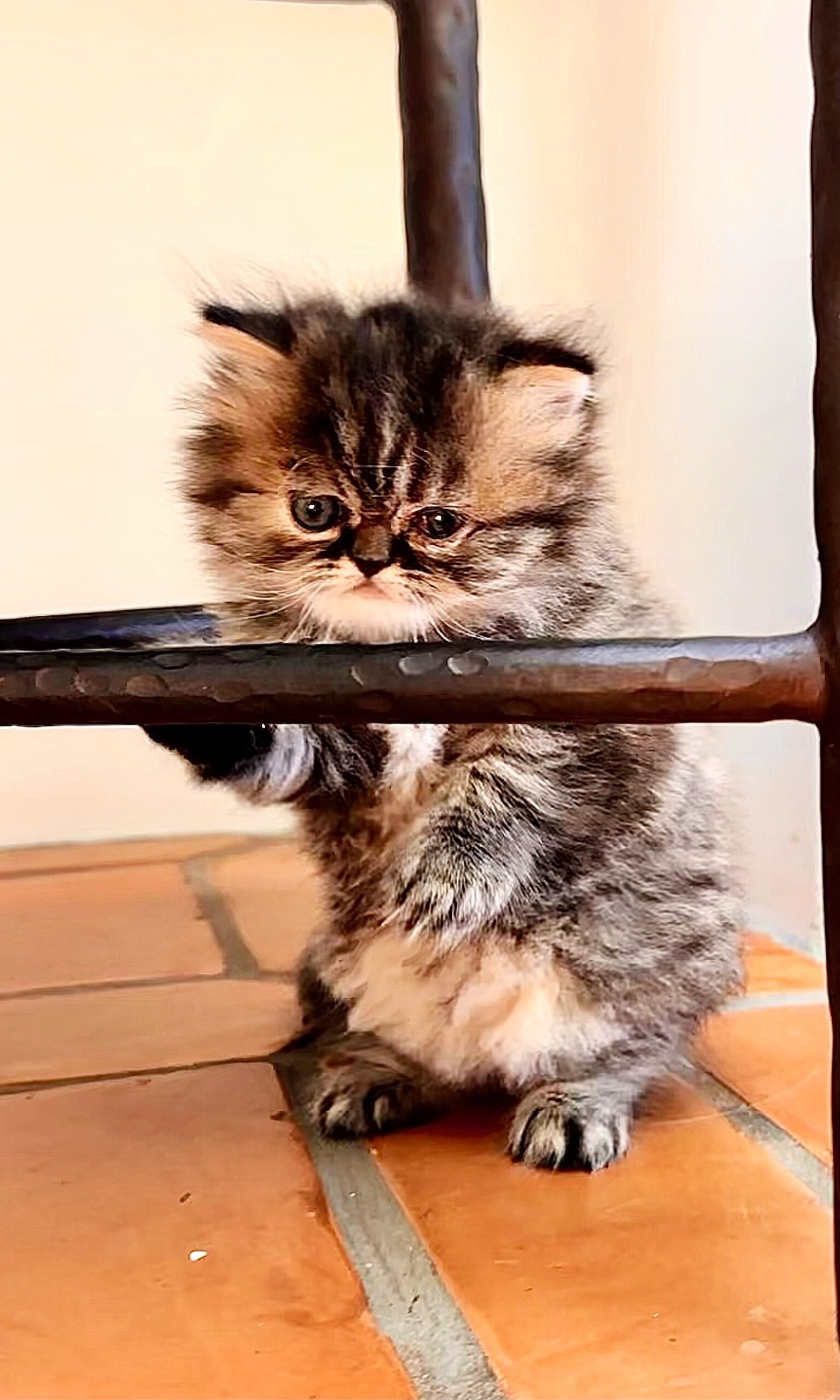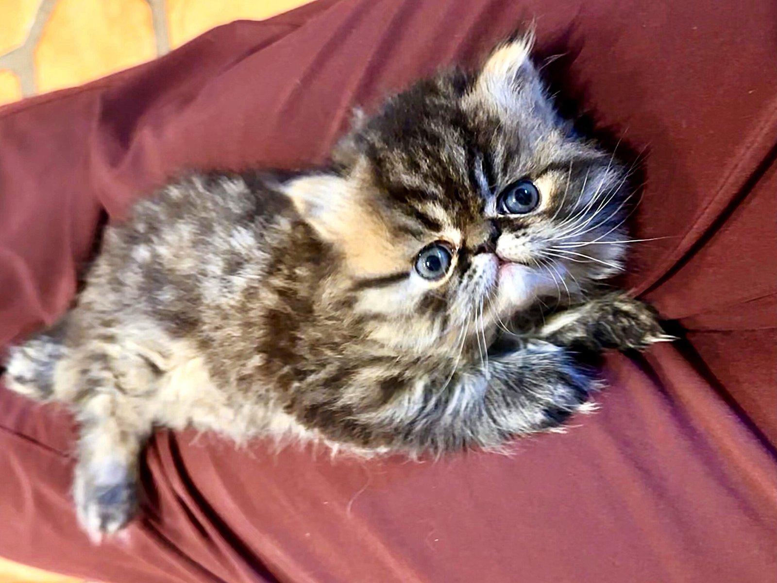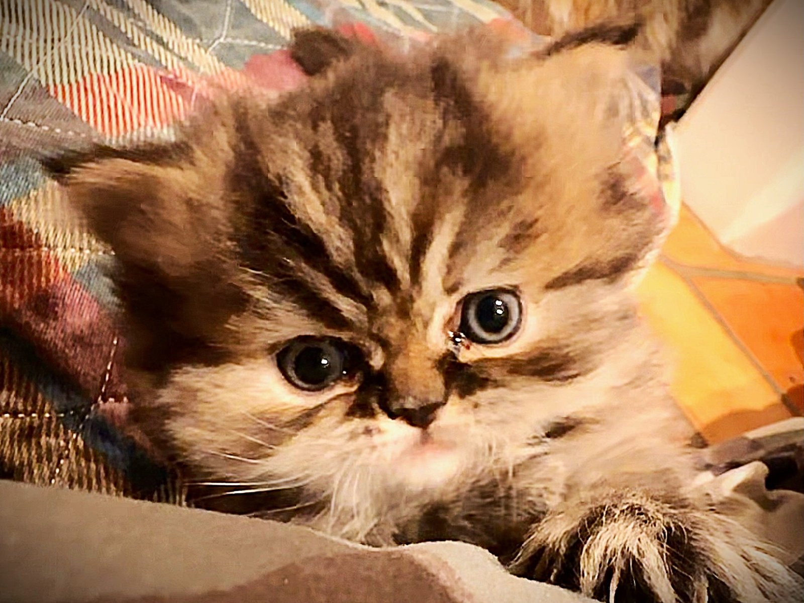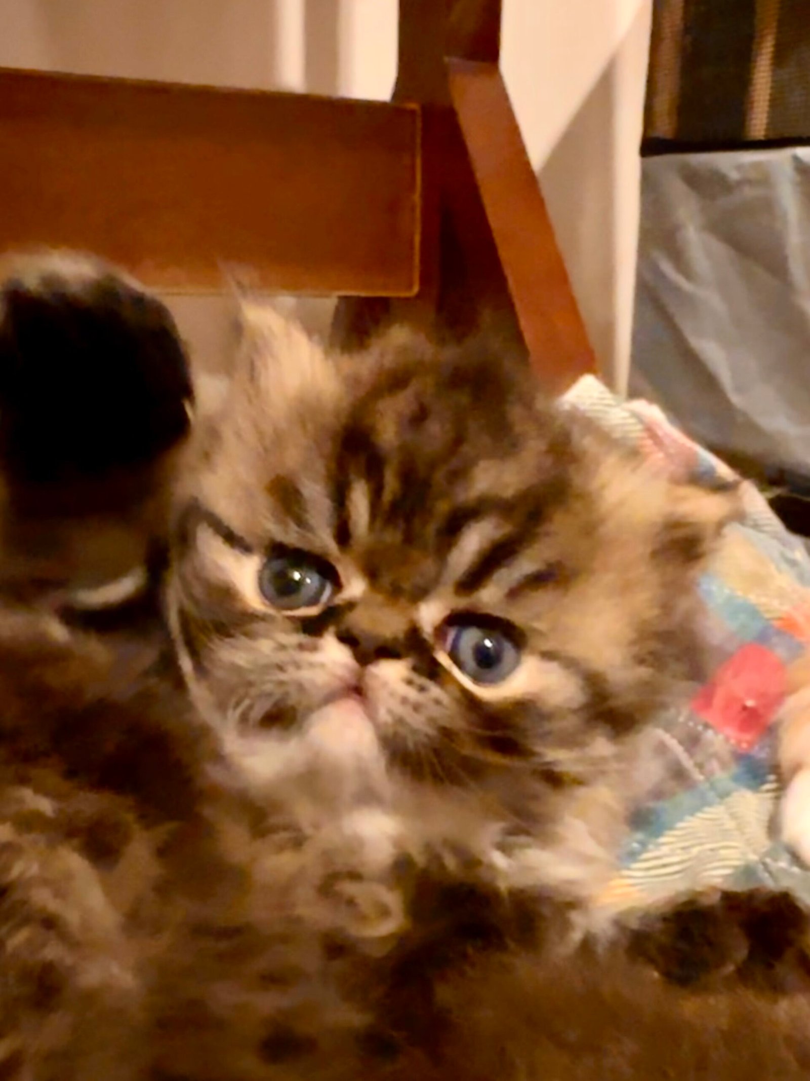 Charlie is our most adventurous kitty. She is a very intelligent Silver-Patched Tabby. She has been the first to try anything new, be it solid foods or exploring new spaces. She wants to bond and loves to be held.