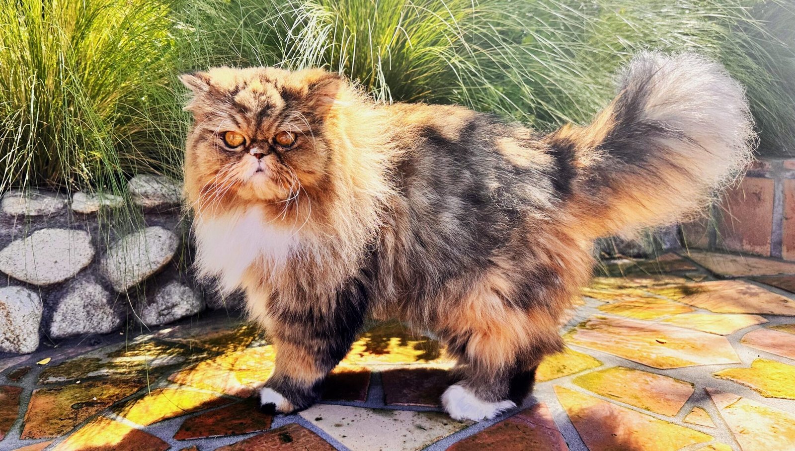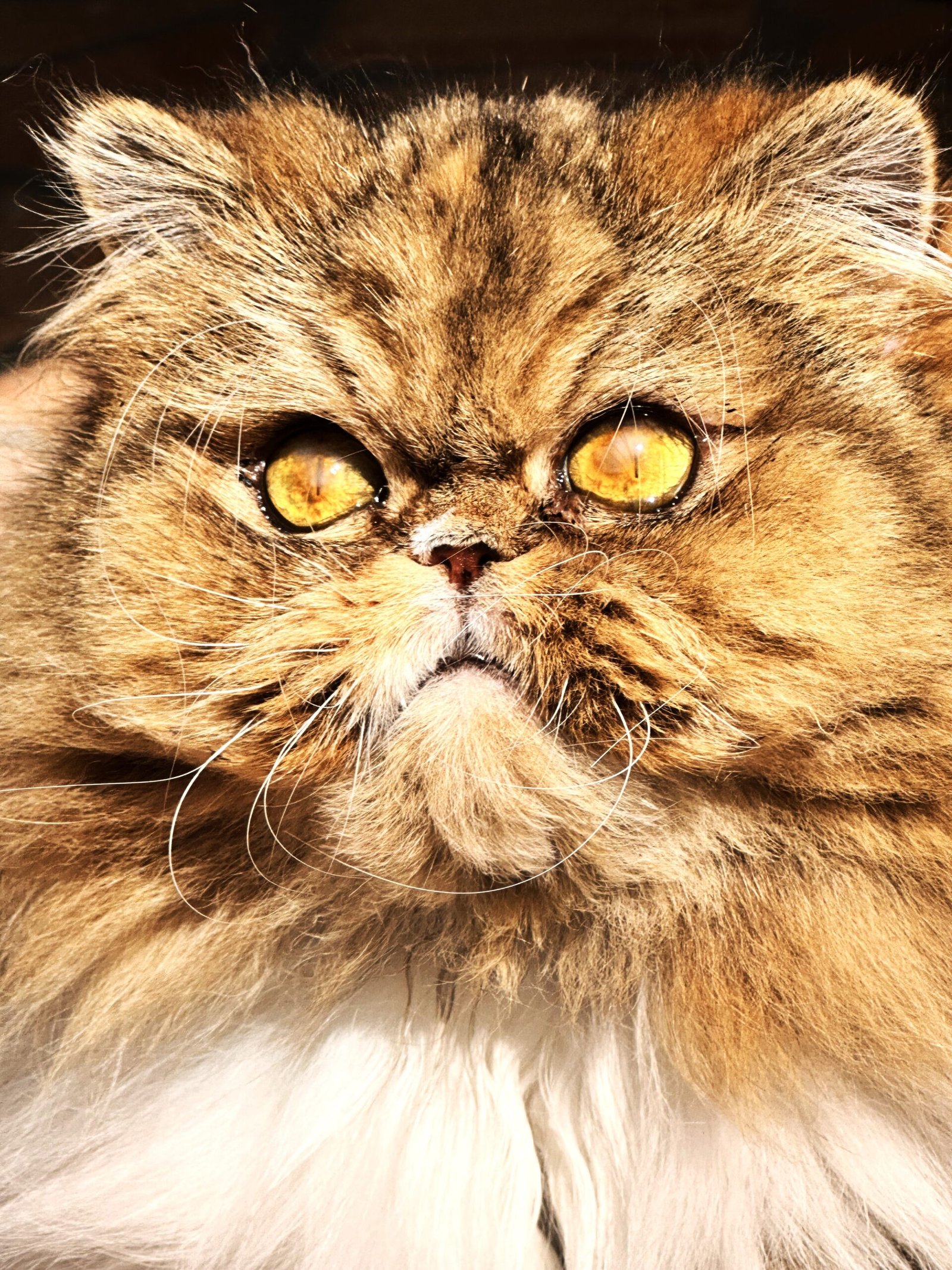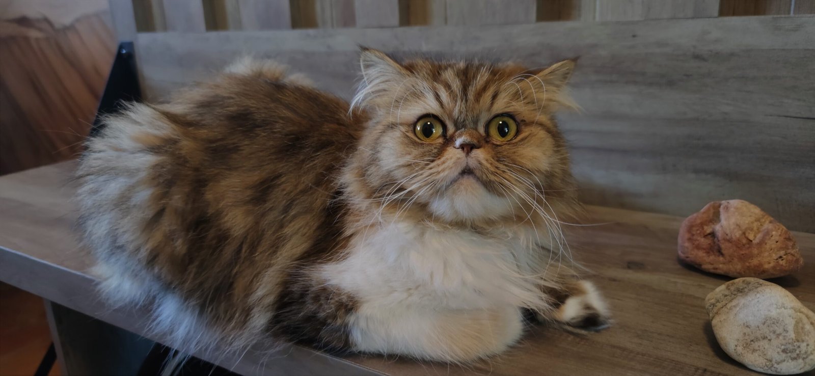 Our Queen, whom we call Butterscotch, is a CFA Certified Brown Tabby Bi-Color Persian.  She has striking huge Golden eyes and an extremely full luxurious coat.  In the photo to the left, she is shown with her summer cut.