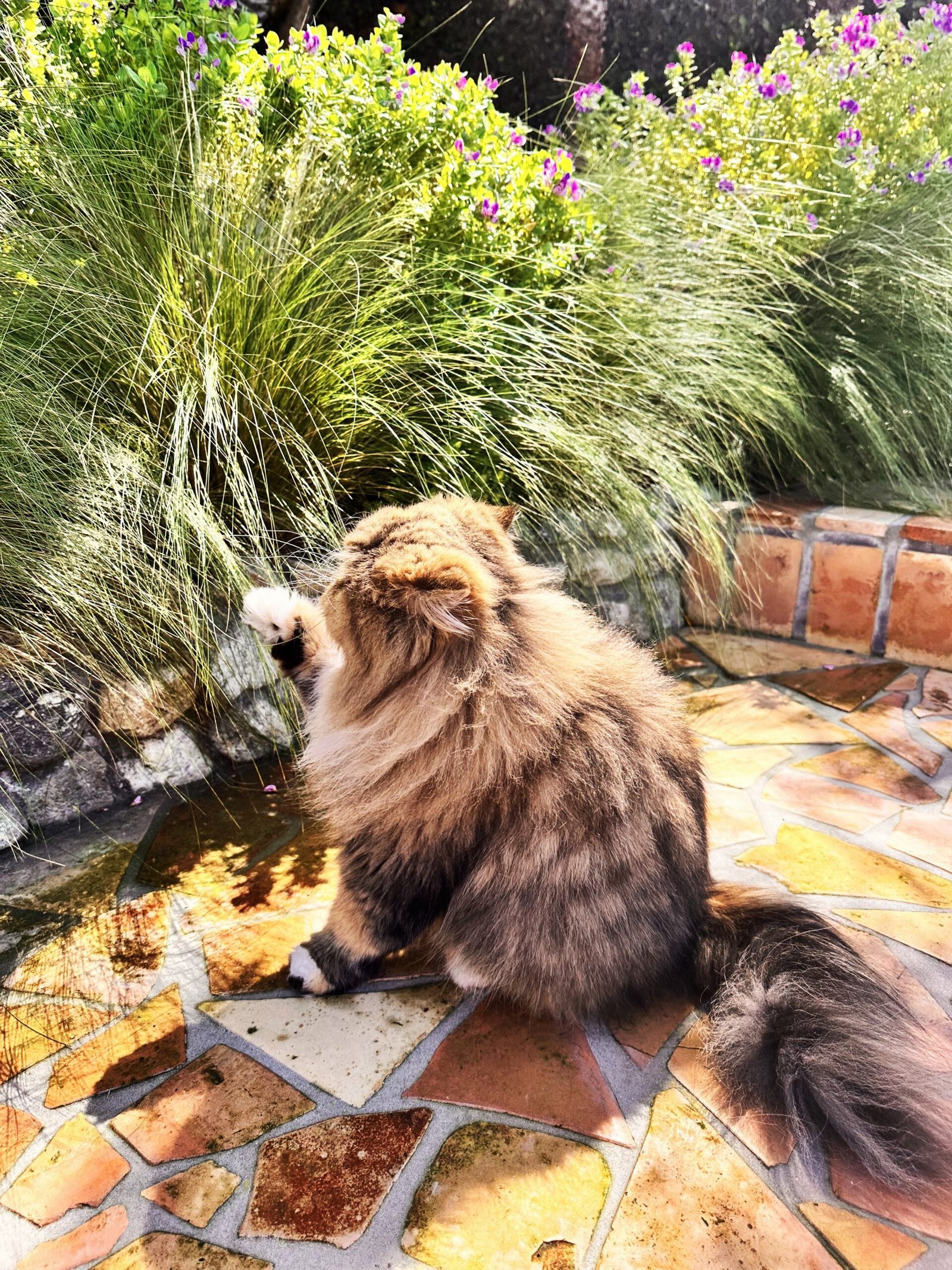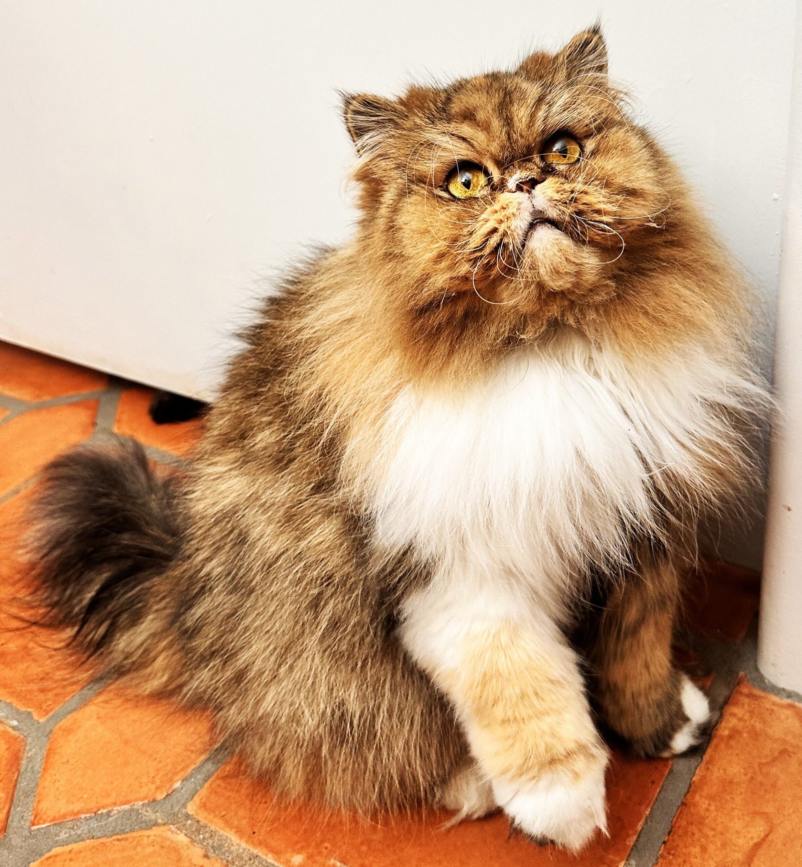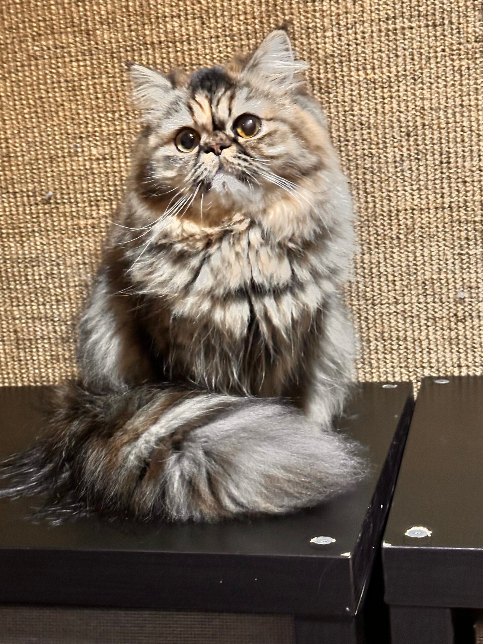 Moose is a unique character, talking to us and flipping his tail magestically to get attention.  He loves affection and food.  He has a calm disposition and is more of a cuddler.