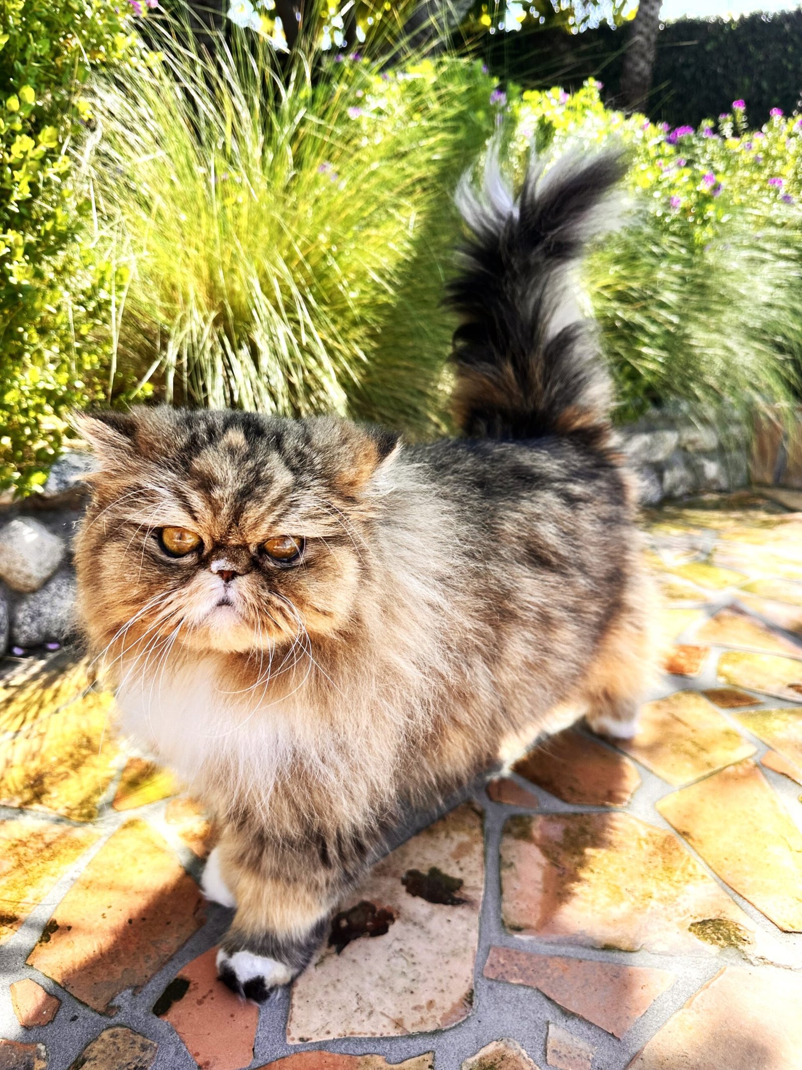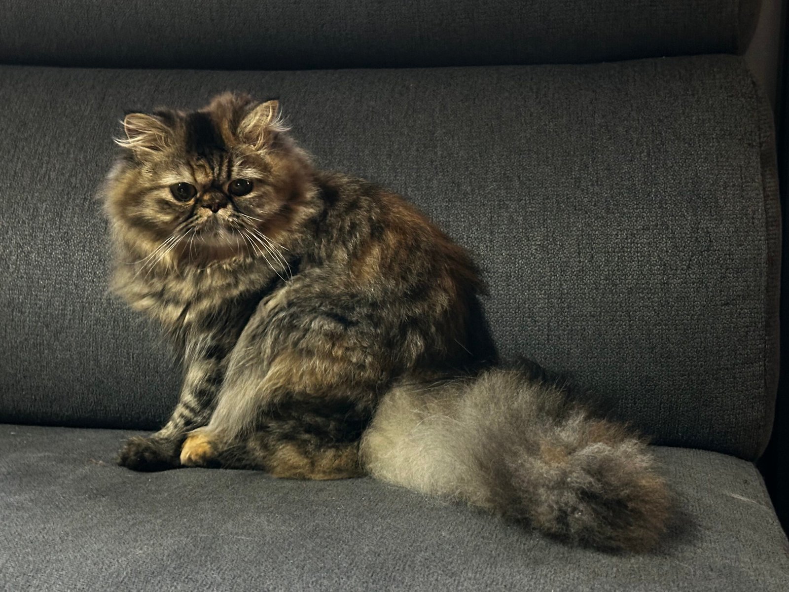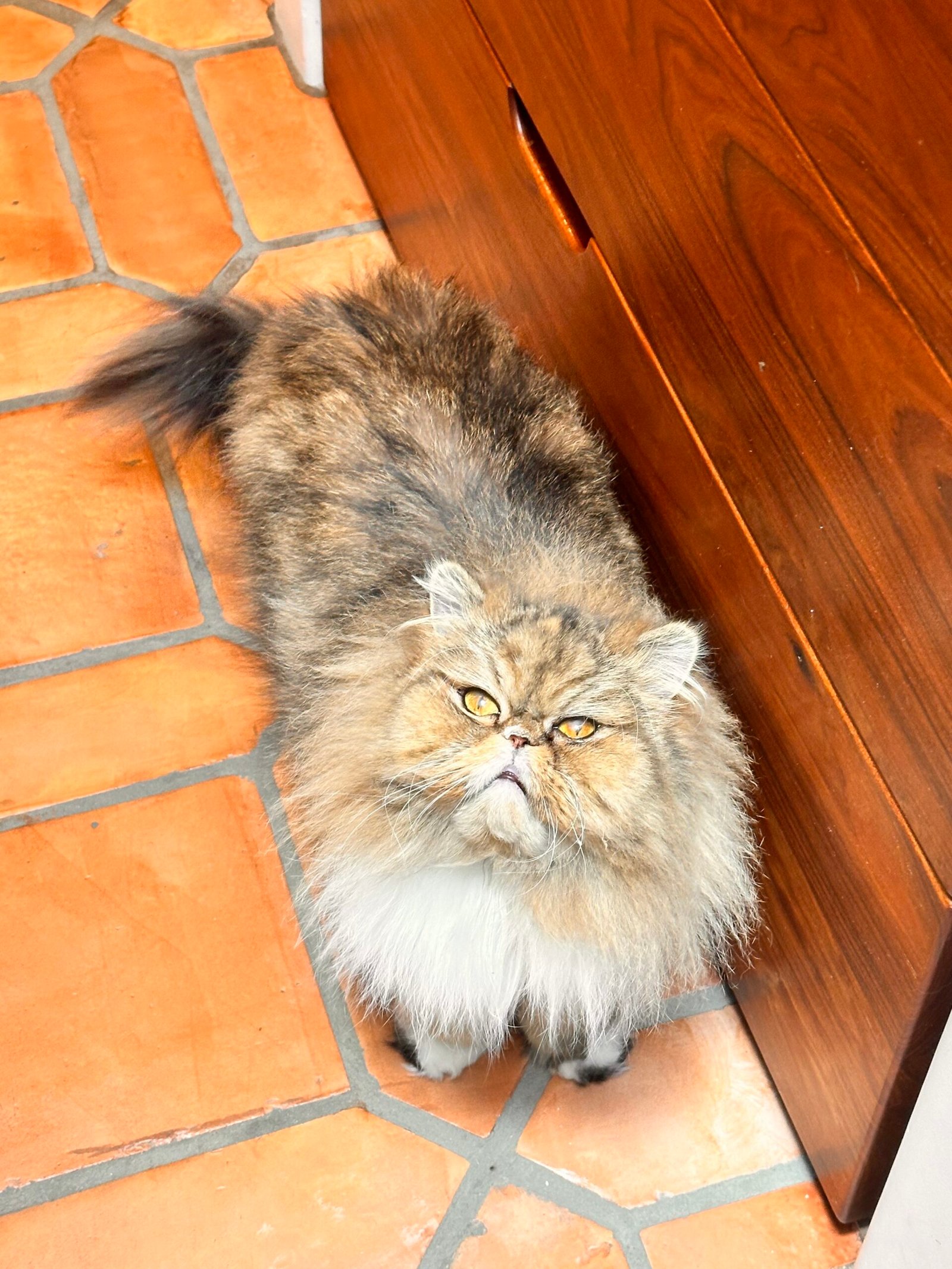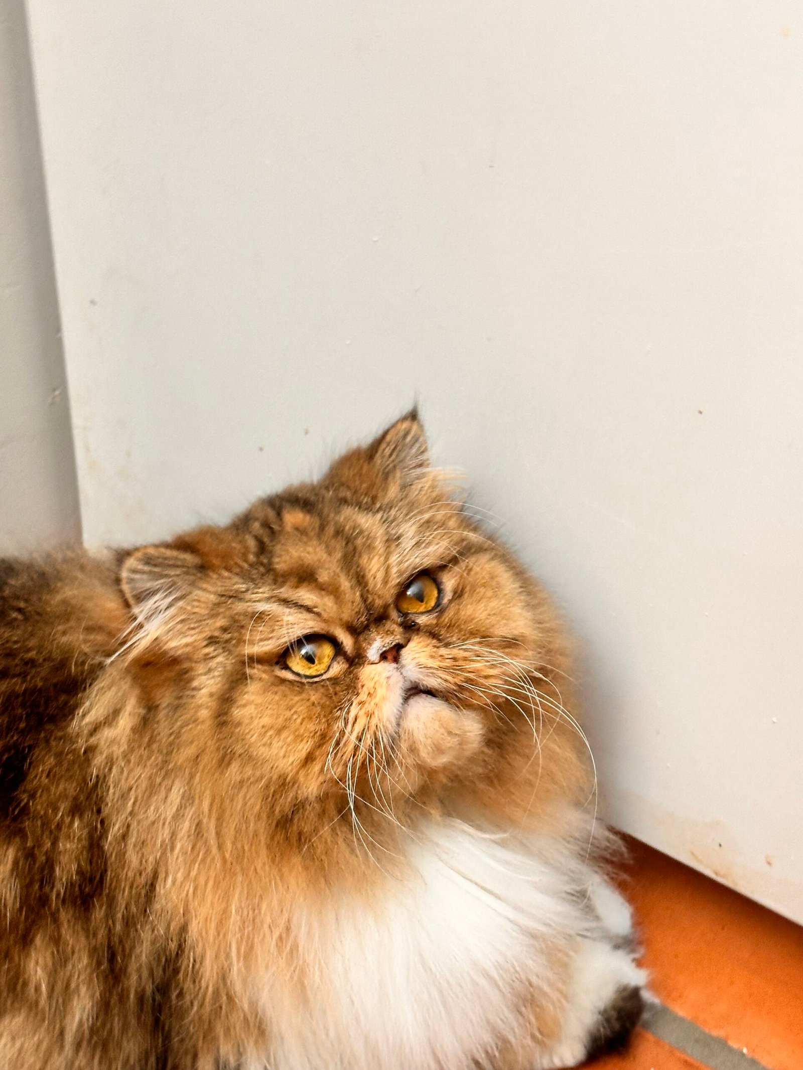Moose is a unique character, talking to us and flipping his tail magestically to get attention.  He loves affection and food.  He has a calm disposition and is more of a cuddler.